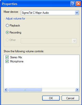 Directions: Go to volume control, options, properties, recording, Make sure that you have Stereo Mix Checked!